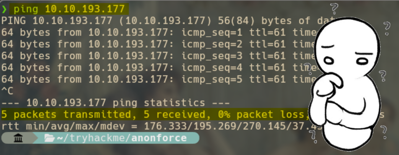 Así que para empezar, voy a confirmar si la máquina está activa, para eso, vamos a usar el ping que nos permite mandar paquetes de bytes. El resultado fue interesante, se transmitieron 5 paquetes, 5 paquetes fueron recibidos y ninguno fue perdido. Así que la máquina está activa y conectada a la red, pero no por el puerto 80 que es el comunmente usado para el HTTP.