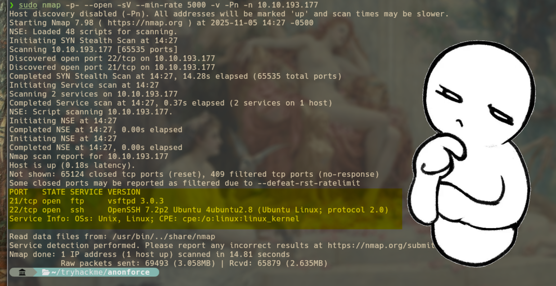 Ya con estas dos cosas, puedo pasar a mandar un nmap para ver que puertos están abiertos. Después del reconocimiento, nmpa me arrojó que habían dos puertos abiertos: el puerto 21 que es para ftp y el 22 que es un puerto ssh.