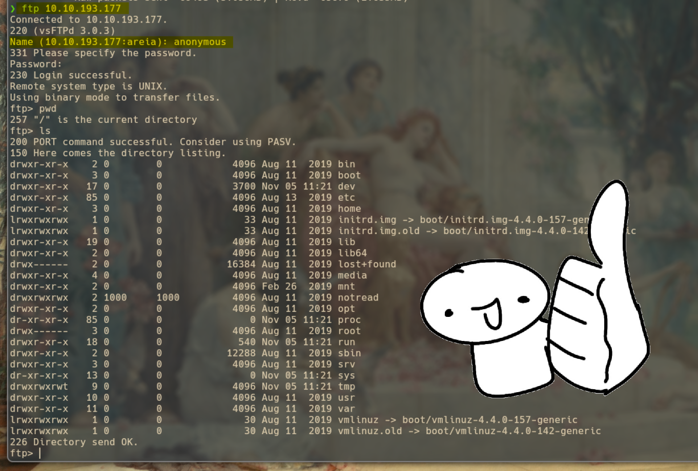 Una característica del protocolo ftp es que nos permite conenctarnos de forma anónima solo sí en las configuraciones está activado, así que vamos a intentar hacerlo y para mi sorpresa estaba activo, de esta forma tenemos cierto acceso a los archivos dentro de la máquina.