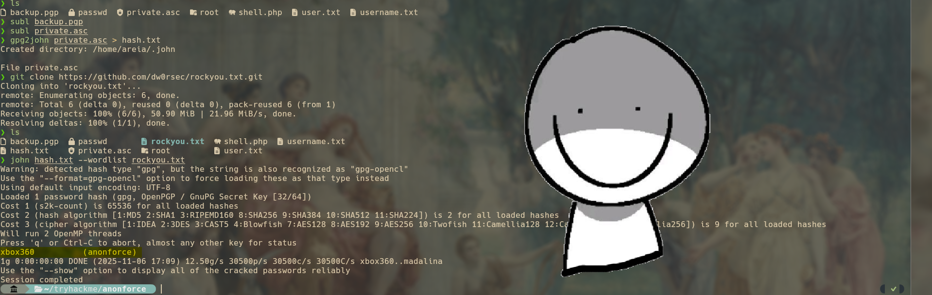 Con esto listo, hay que desencriptarlo y para mi desgracia deberé usar John para hacerlo. Tengo mis malas experiencias con la herramienta, jamás la hago funcionar como debería, así que solo me queda aguantarme y tratar de hacerla funcionar. Pero primero debos saber la clave para desencriptar el archivo pgp, así que llamaos al John con el diccionario de rockyou para poder saber cual es esta palabra clave y así tener acceso al pgp.