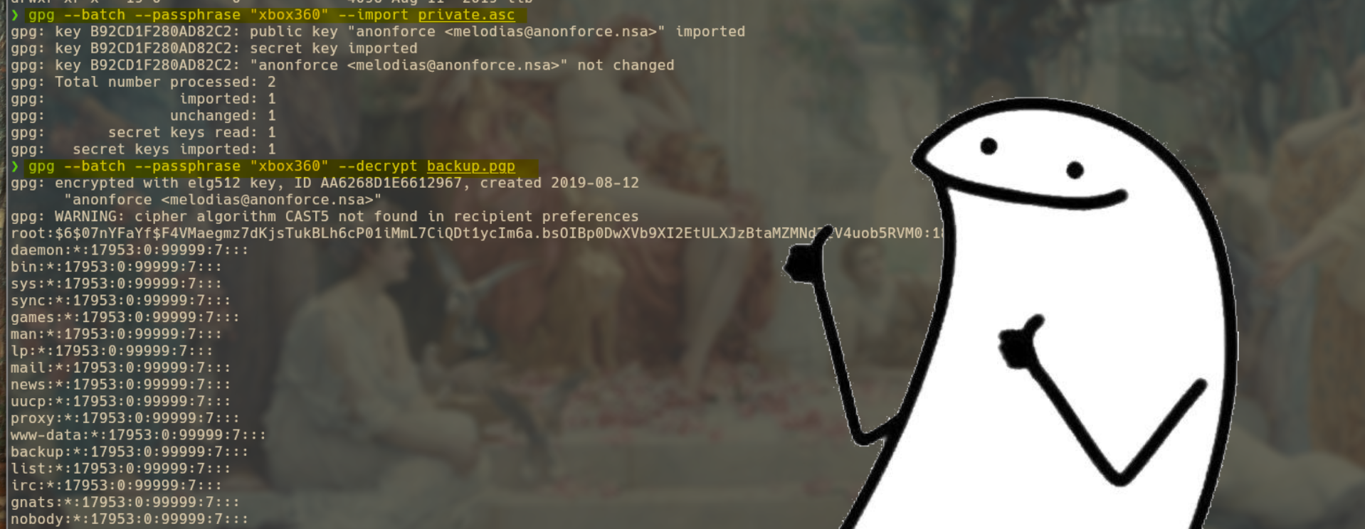 Vemos que la contraseña es xbox360, así que ahora solo hay que meter la palabra clave en pgp, así que simplemente lo meteos y ya tenemos el file desencriptado. Lanzo un cat para poder leer que hay en el file y enseguida reconozco qué es, es un archivo shadows y esto es súper mega importante, ya que contiene los hashes para decifrar las contraseñas del file passwd de linux.
